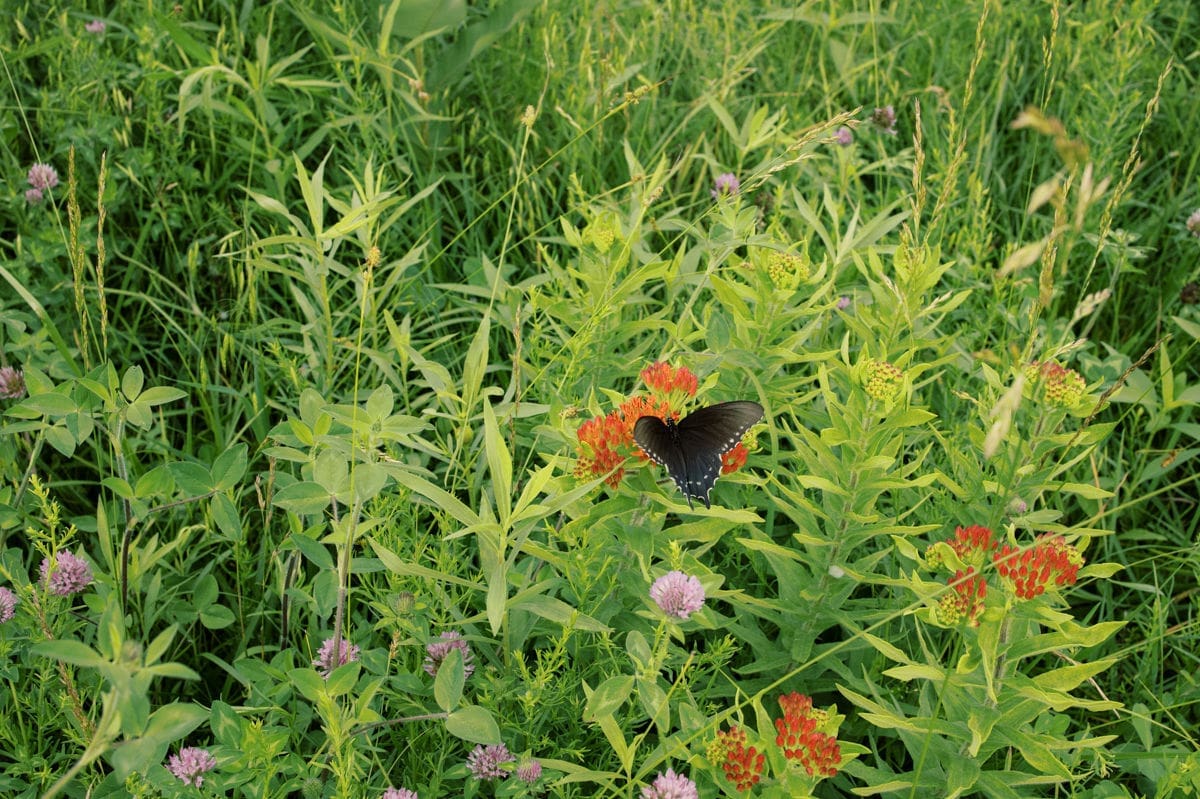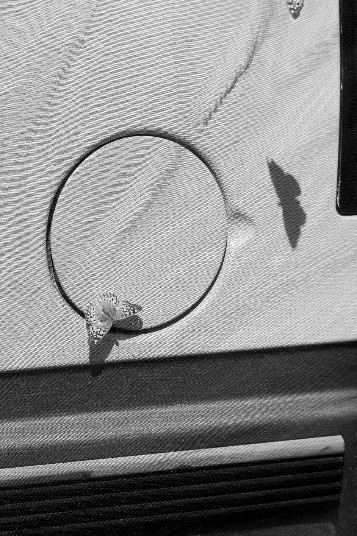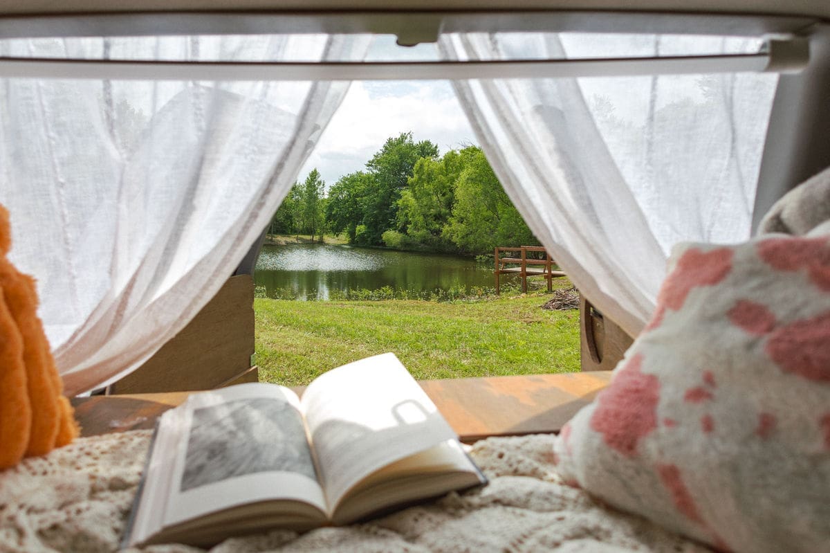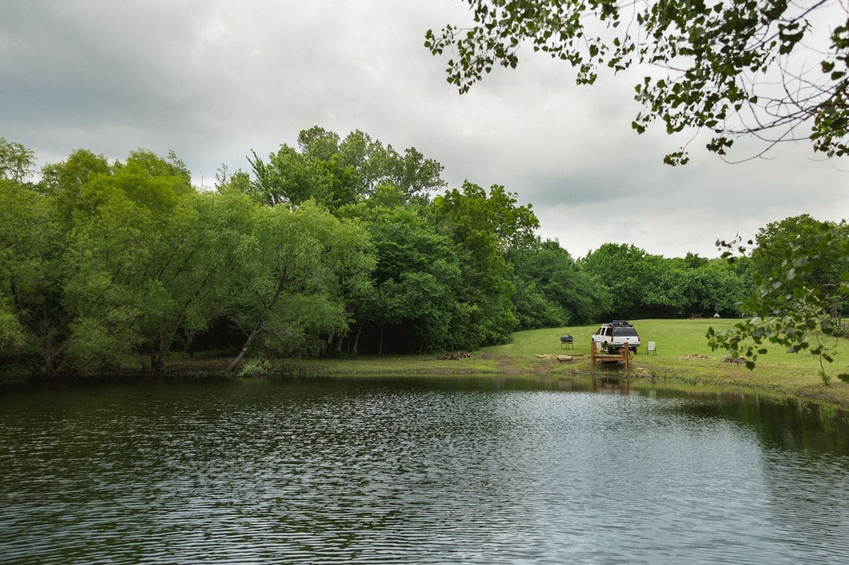 The next morning I was driving through rain again, but made a pit stop at a roadside farm that had a hand-painted sign and an adorable little cashier. Picked up bacon and eggs for the week and felt wildly proud of myself. Then, I landed at a small pond campsite outside Topeka, Kansas. Trails, a dock, that sort of thing. The sky that night was showing off in the most quiet way—deep purples behind storm clouds, the kind of dusk that makes you feel like you’re inside a painting. Butterflies hitched a ride on my window curtain while I read Terry Tempest Williams.